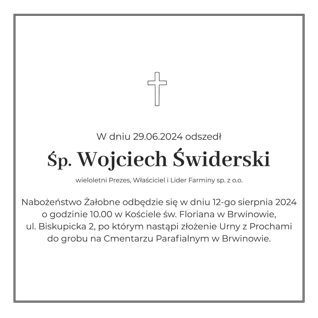 Z głębokim żalem zawiadamiamy, że 29 czerwca 2024 r. zmarł Wojciech Świderski, wieloletni Prezes, Właściciel i Lider Farminy sp. z o.o.
