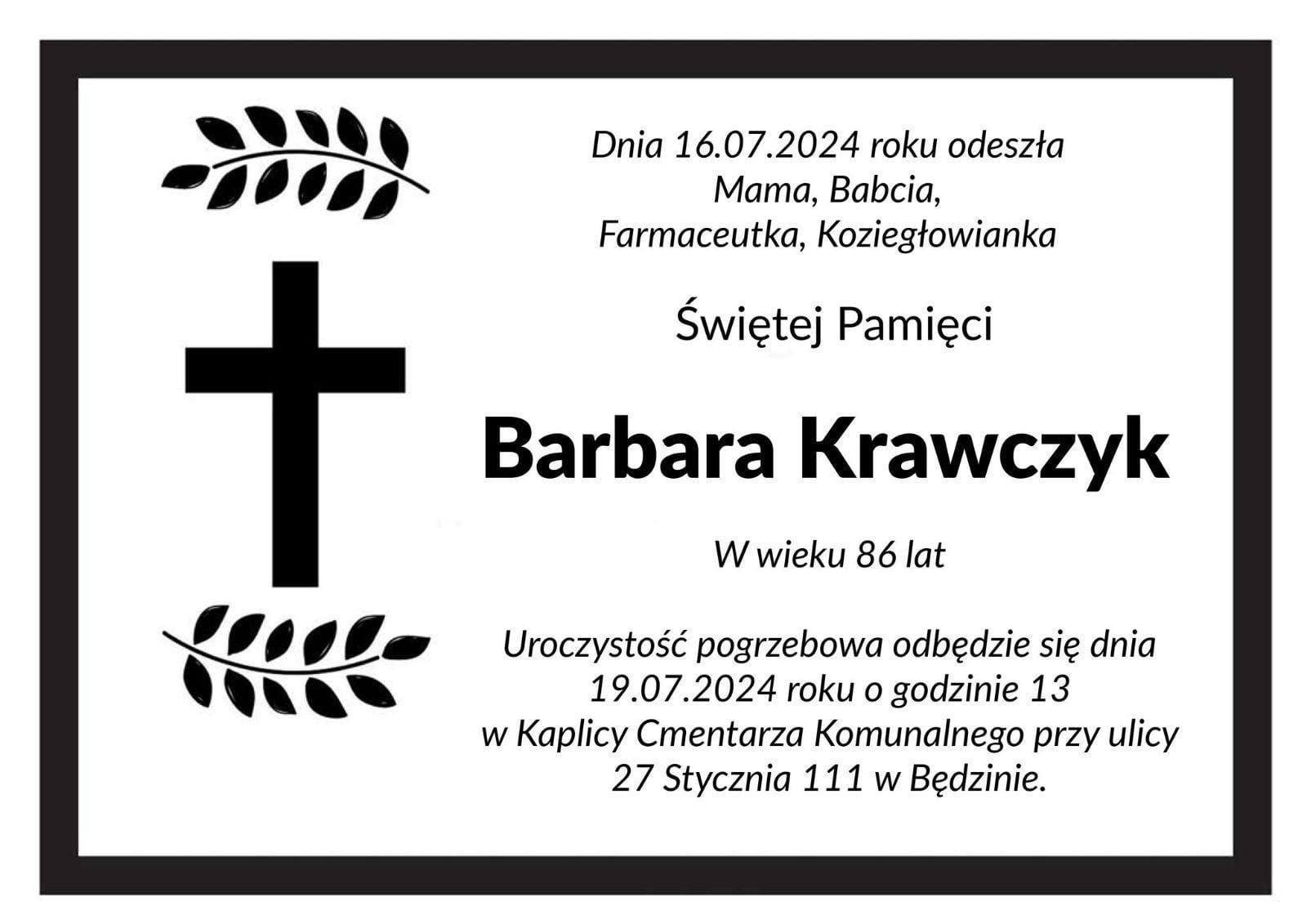Z głębokim żalem zawiadamiamy, że 16 lipca 2024 r. zmarła w wieku 86 lat mgr farm. Barbara Krawczyk, pracownica aptek w Sosnowcu.